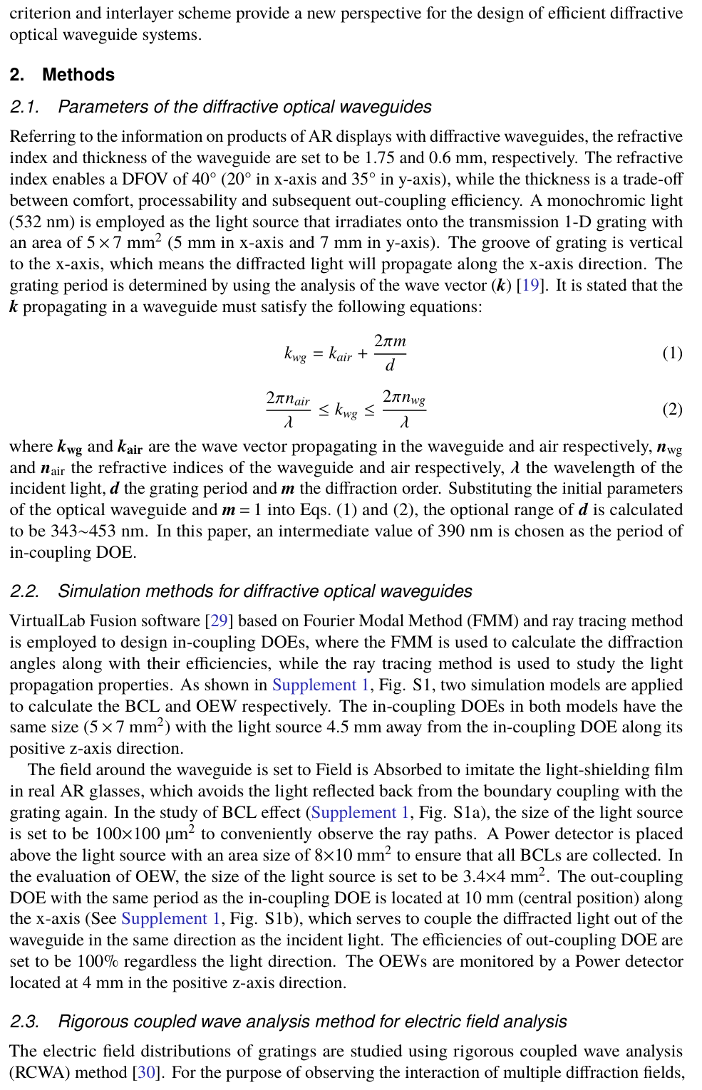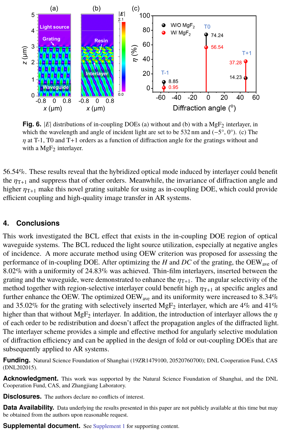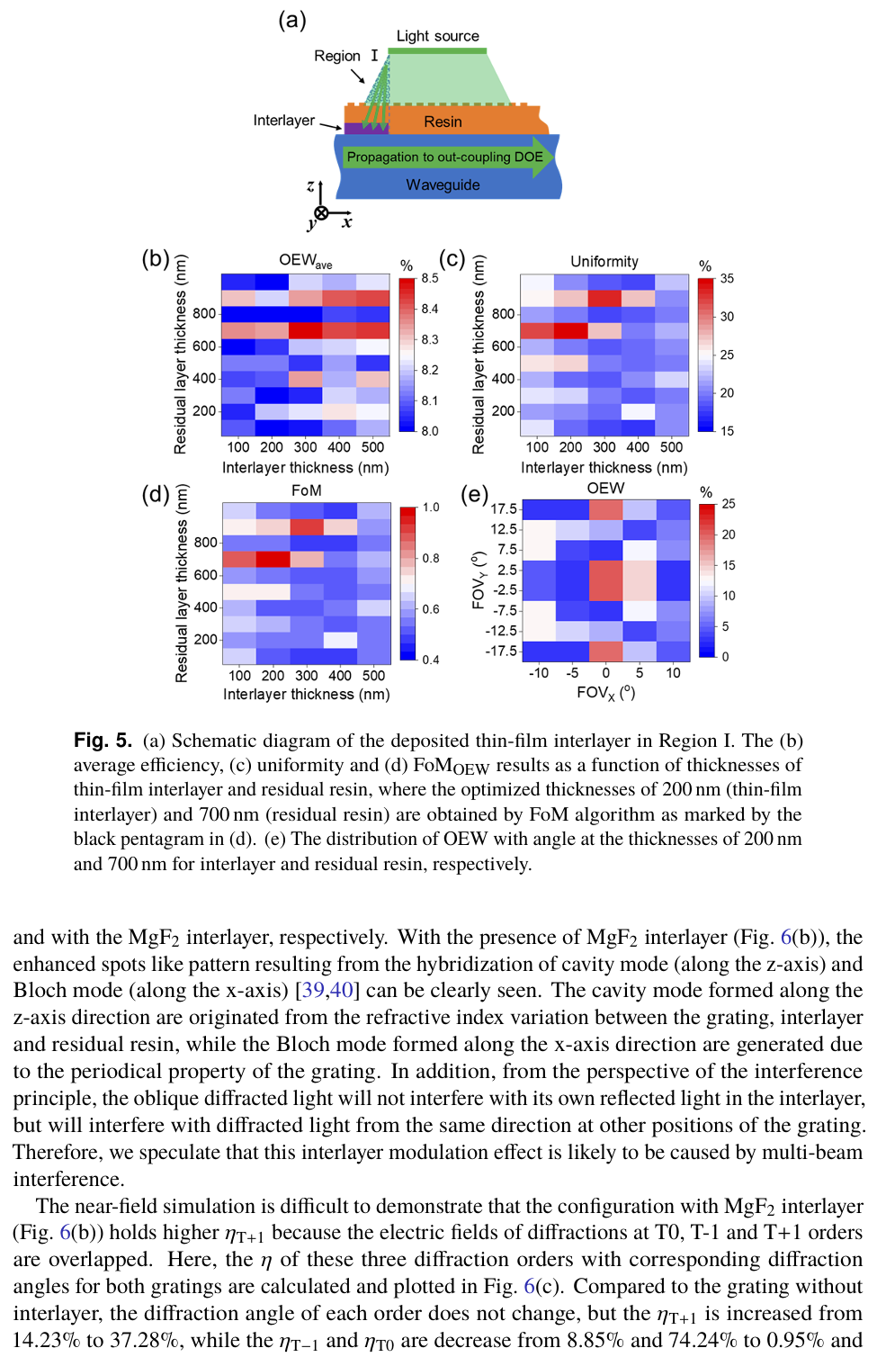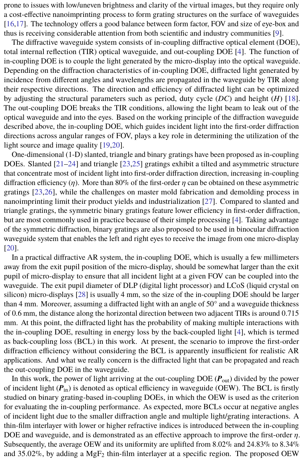 摘要:整体效率和图像均匀性是增强现实显示的重要评判标准。传统的入射耦合光栅设计仅致力于提高一阶衍射效率,却未考虑光波导中衍射光的多次相互作用,因此存在不足。本研究中,为优化耦合光栅设计,引入了入射耦合表面浮雕光栅的背耦合损耗(BCL),以及到达出射耦合光栅的光功率与入射光功率的比值(定义为波导光效率,OEW)。通过在波导与光栅之间插入中间层,我们展示了一种兼具独特角度选择性与高衍射效率的简单有效的方案。引入区域选择性氟化镁(MgF₂)中间层后,在 40° 视场角下,优化后的平均波导光效率从 8.02% 提升至 8.34%,其均匀性从 24.83% 提升至 35.02%。