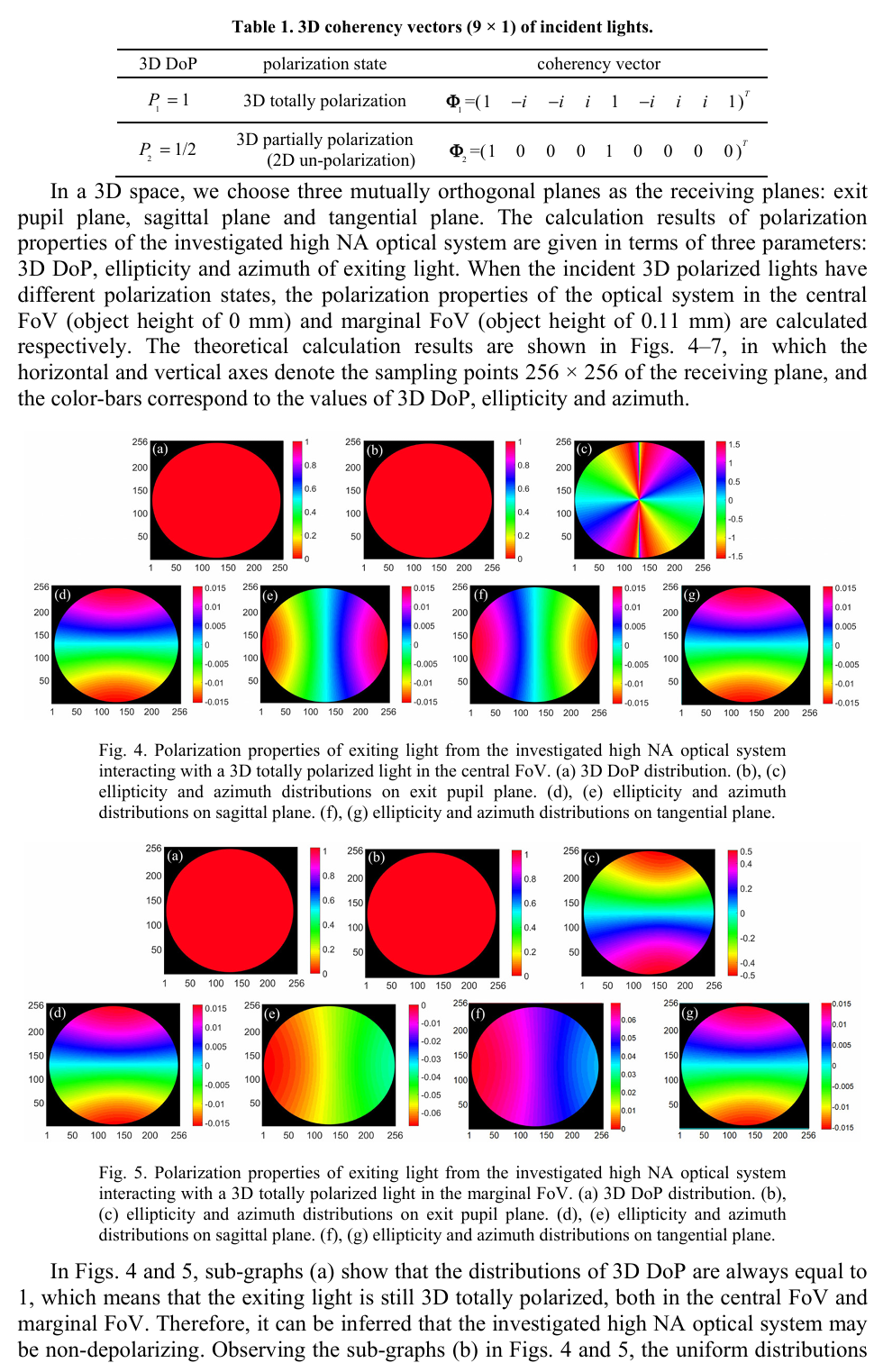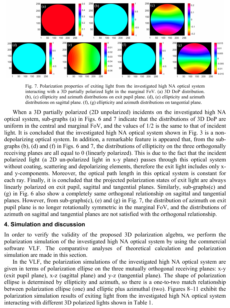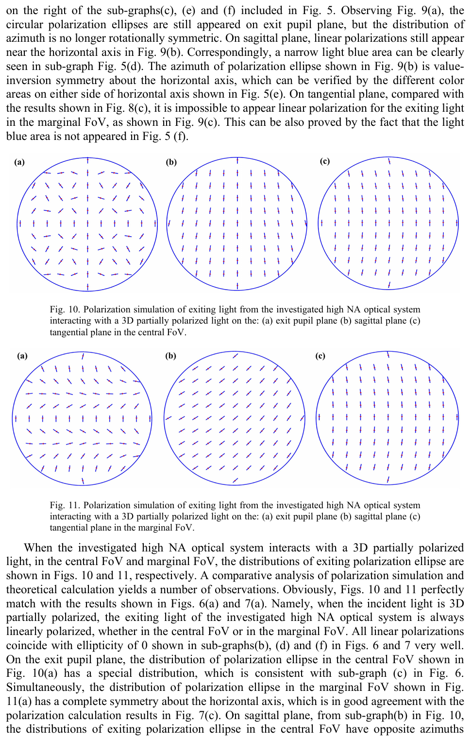 摘要:本文利用三维相干矢量(9×1矩阵)构建了一种新型三维偏振代数,可用于计算所有偏振敏感光学系统的偏振特性,尤其适用于入射光场为部分偏振或非偏振的情况。基于该三维偏振代数,我们对高数值孔径(NA=1.25油浸式)显微物镜的偏振特性进行了理论分析,并采用商用软件VirtualLab Fusion对该高数值孔径光学系统进行了偏振仿真。通过对比理论计算与仿真结果,两者呈现出完全匹配的关系,证实该三维偏振代数能够有效量化所有偏振敏感光学系统的三维偏振特性。