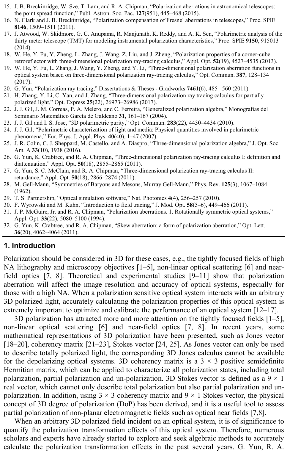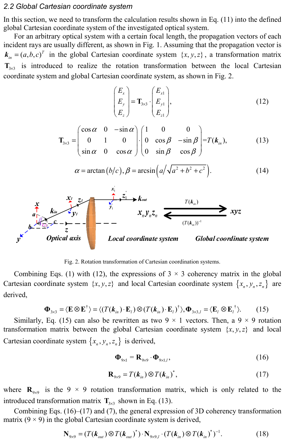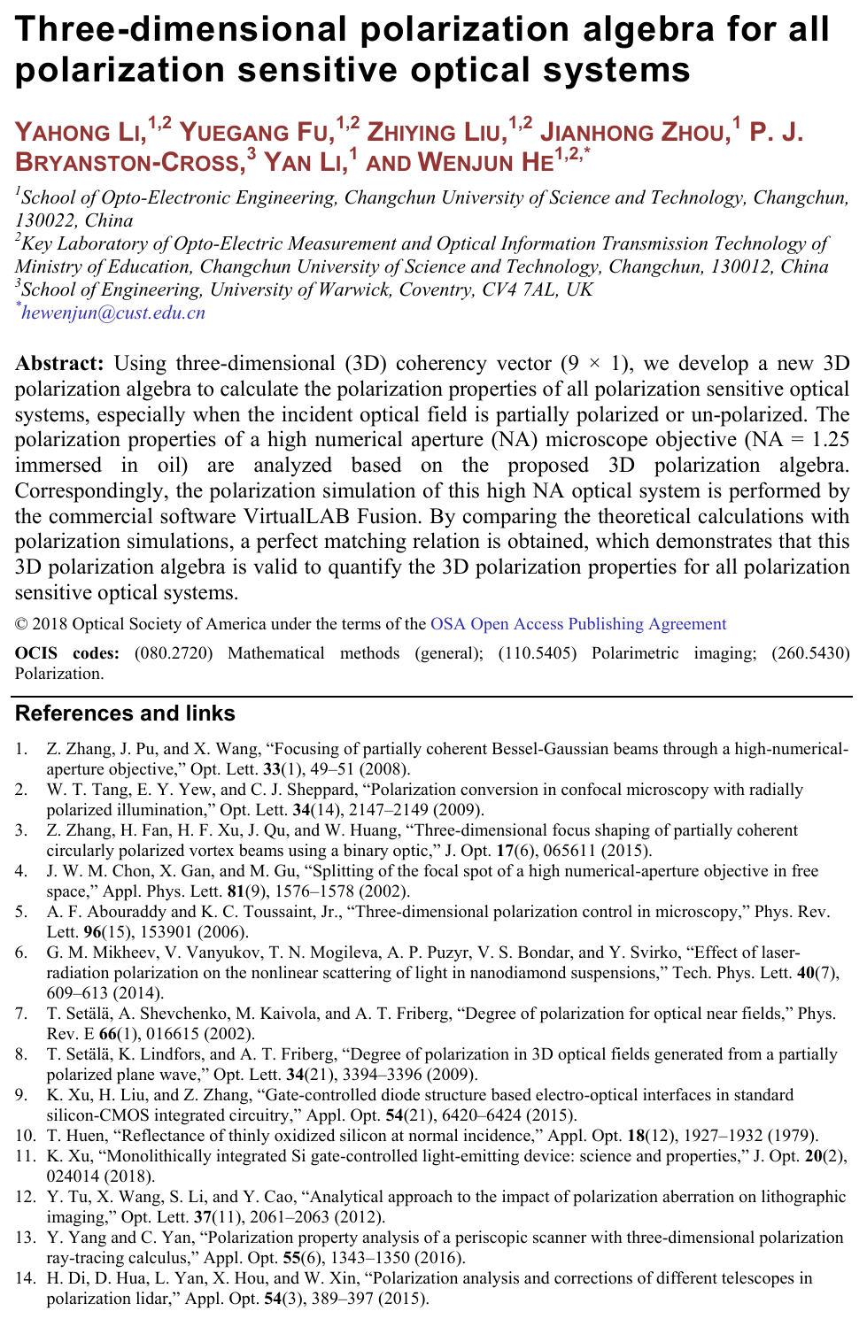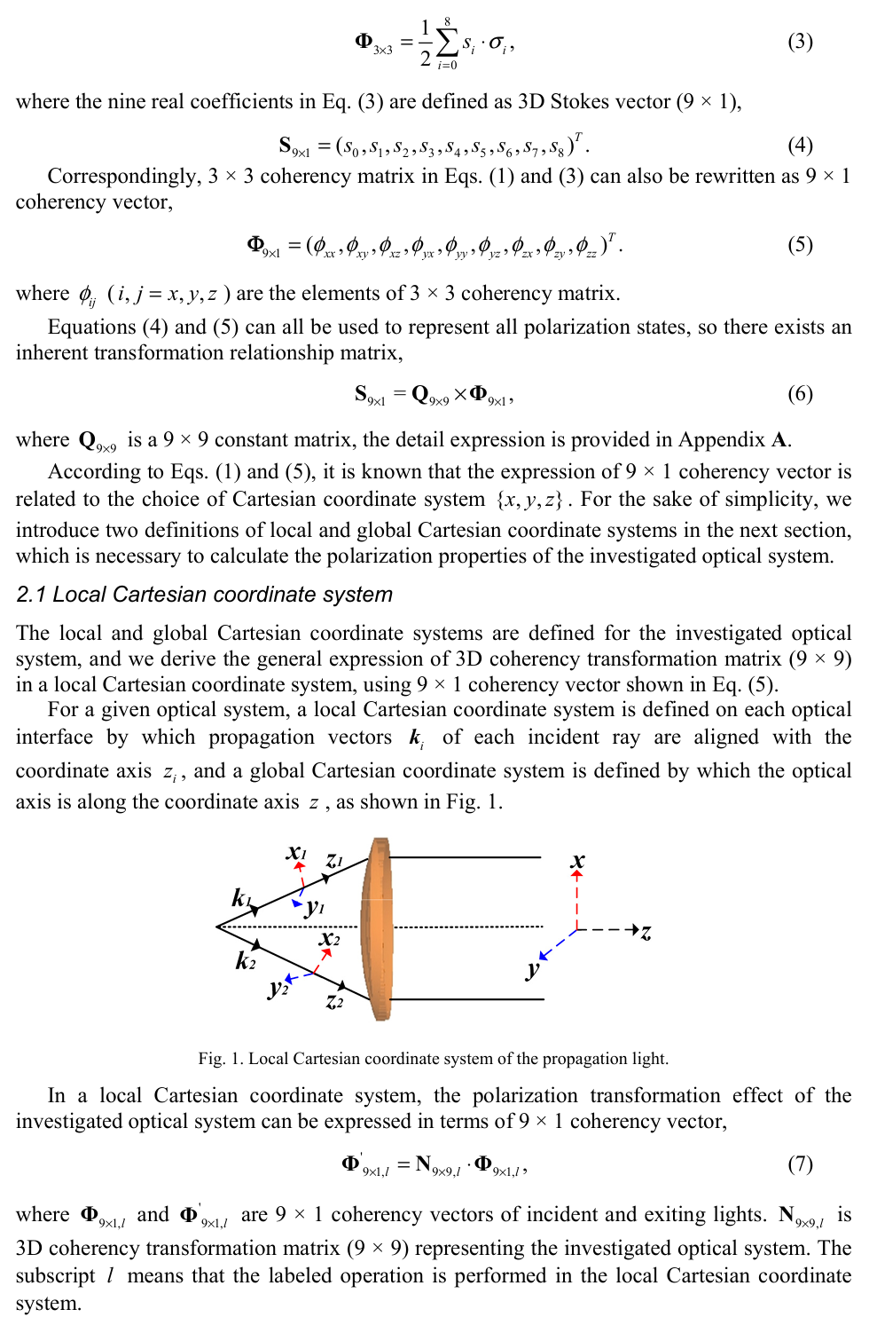 摘要:本文利用三维相干矢量(9×1矩阵)构建了一种新型三维偏振代数,可用于计算所有偏振敏感光学系统的偏振特性,尤其适用于入射光场为部分偏振或非偏振的情况。基于该三维偏振代数,我们对高数值孔径(NA=1.25油浸式)显微物镜的偏振特性进行了理论分析,并采用商用软件VirtualLab Fusion对该高数值孔径光学系统进行了偏振仿真。通过对比理论计算与仿真结果,两者呈现出完全匹配的关系,证实该三维偏振代数能够有效量化所有偏振敏感光学系统的三维偏振特性。
